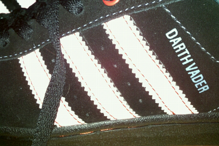 i bought these online from a shop in hong kong last year in march, sayin they dealt with 'factory defects' which were unsellable on the market, but were still good enough to sell for a discount..they weren't dirt cheap, and i did contact the site a few times before i ordered to ask Q's..everything seems ok, except for the obvious name on the side 'darthvader' instead of 'darksidestar' . obvious stitch error on the side stripe, and you can see the white line where the stripe should line up. it's got the 3M reflective tape, and the sizing fits, it suede (or suede smelling and feeling) [/font] the interior stitching seems to be of good quality. the box numbers line up with the darth vader shoe, but this has the body of the CLOT darksidestar?? fake or just a unique? im really hoping for the later..